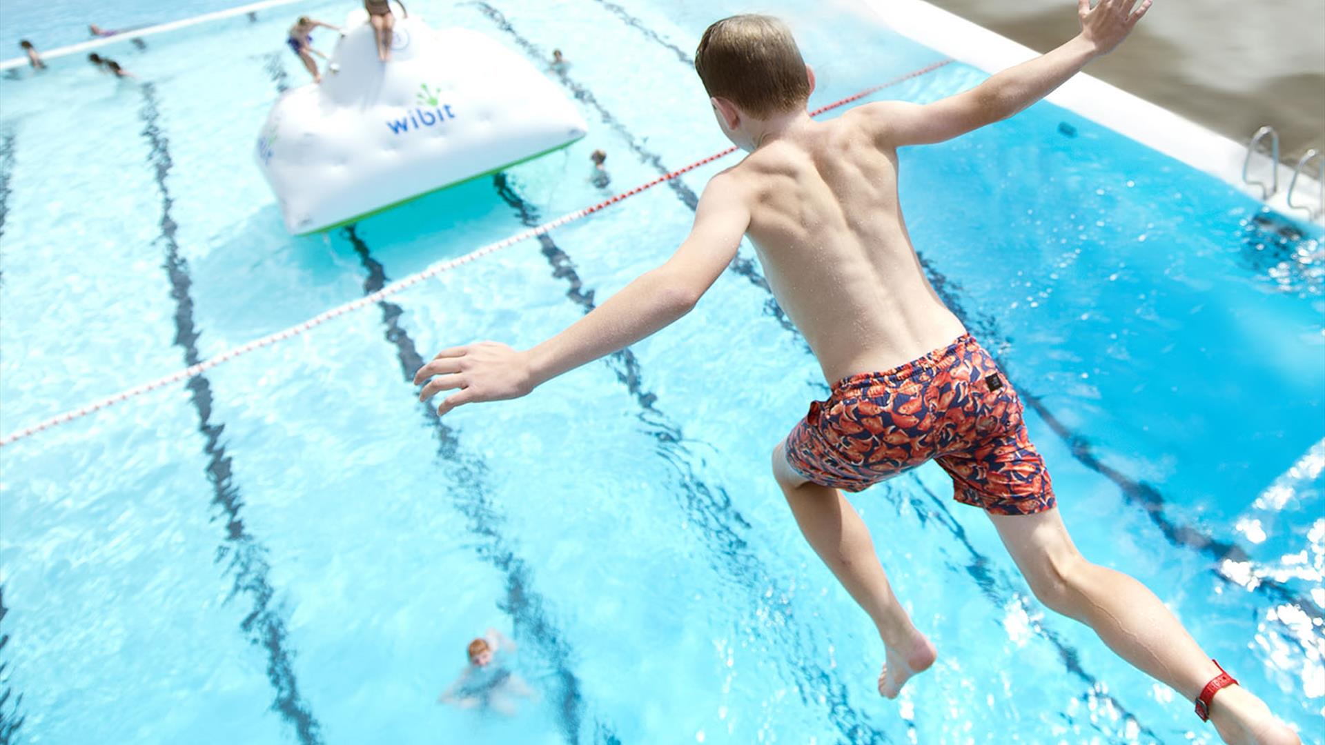 Utebassenget er oppvarmet og har egen barnedel. Selve bassenget er fire meter dypt, og i enden er det tre stupetårn på en, tre og fem meter. Det er tre sklier rundt bassenget. I barnedelen er det en liten sklie, og ut i hovedbassenget er det en mindre familiesklie. I enden av bassenget bak stupetårnene, er det bygget en høyhastighetssklie med et kraftig fall fra 8,5 meters høyde! Så det er bare å hoppe i det!
