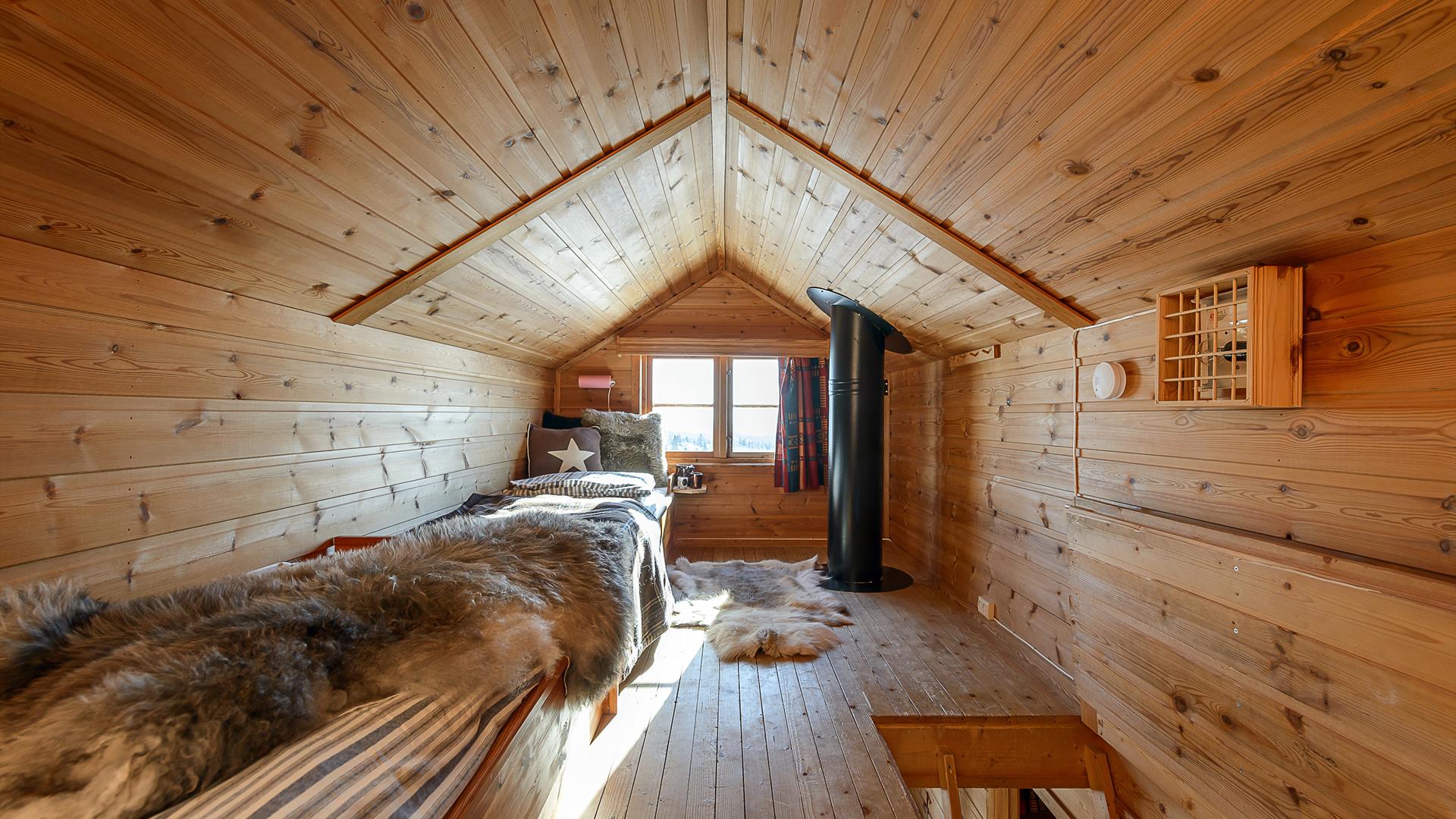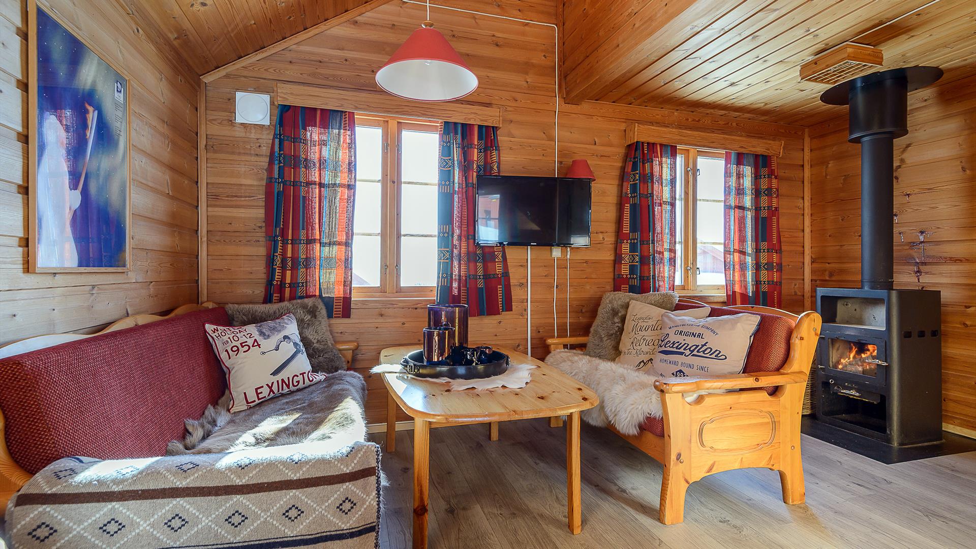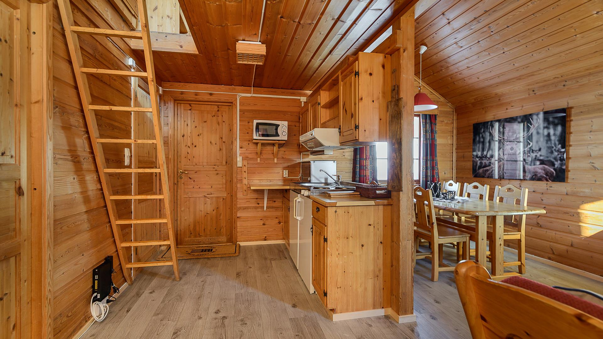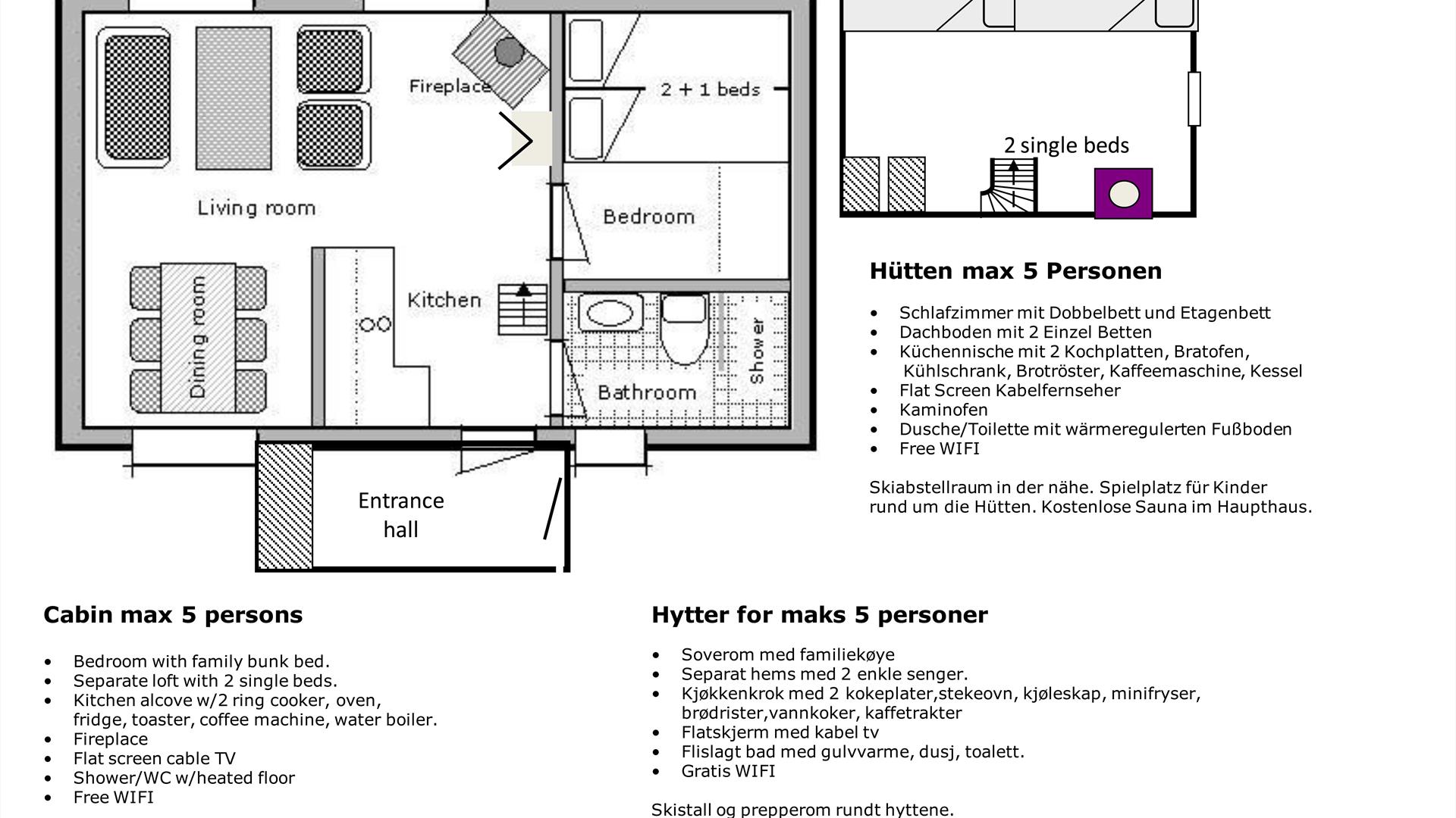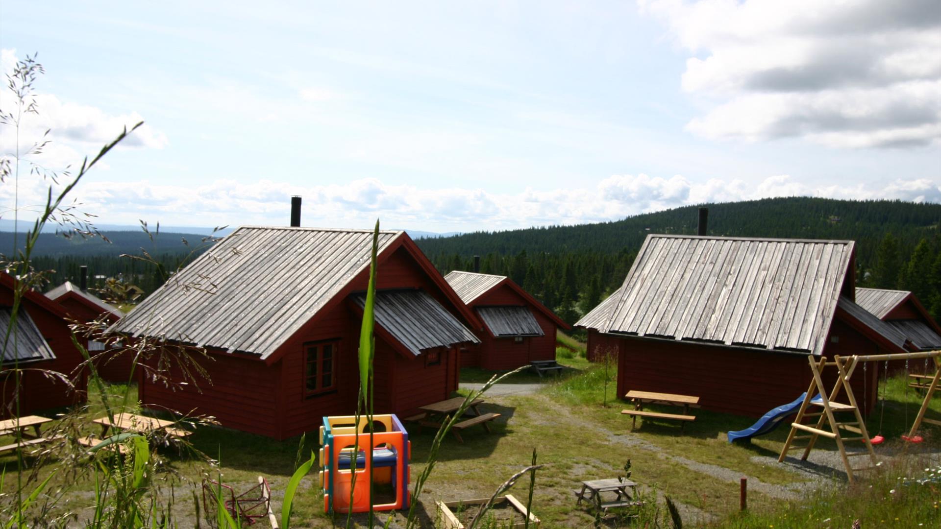 Alle hyttene er like og har 1soverom med familiekøye og en hemsetasje med 2 enkle senger. Hyttene har fullt utstyrt kjøkken for selvhushold, stue med peisovn, spisestuekrok, bad med oppvarmet gulv.